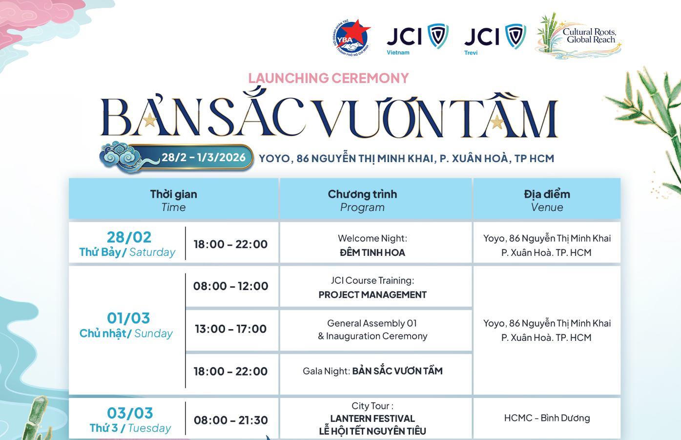 Chuỗi sự kiện được thiết kế đa tầng trải nghiệm, nơi giá trị JCI hòa quyện cùng bản sắc văn hóa Việt, lan tỏa tinh thần kết nối – học hỏi – phát triển bền vững.